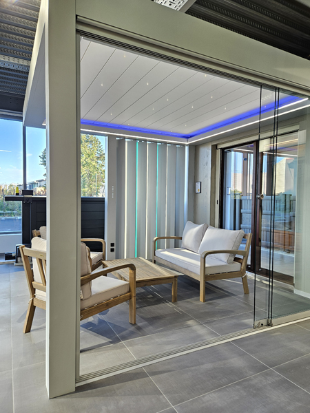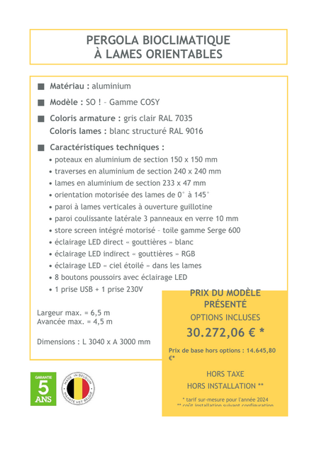 La pergola bioclimatique en aluminium allie élégance et innovation pour créer un espace extérieur adaptable en toute saison. Grâce à ses lames orientables, vous pouvez moduler l'ensoleillement et la ventilation selon vos envies, offrant confort et protection contre les intempéries. Transformez votre terrasse en un lieu de détente moderne et accueillant, tout en profitant d'une structure durable et sans entretien.